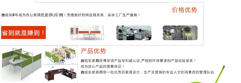 深圳市鑫銘東家具有限公司專業(yè)銷售各類辦公家具!產(chǎn)品涉及多種系列,如:班臺、班椅、屏風(fēng)、會議桌、會議椅、辦公沙發(fā)、茶幾、辦公桌、文件柜、電腦桌椅、各式餐臺、餐椅、書柜等辦公家具。 鑫銘東家具擁有一批優(yōu)秀的家具設(shè)計(jì)、生產(chǎn)及營銷的專業(yè)人士和高素質(zhì)的管理隊(duì)伍。銘東家具以"先難后易"之戰(zhàn)略,在產(chǎn)品結(jié)構(gòu)、產(chǎn)品質(zhì)量及服務(wù)水平方面,均推陳出新,力求完善,精益求精。使我們的產(chǎn)品質(zhì)量保持在國內(nèi)外家具潮流的先進(jìn)水平,力求滿足客戶的特殊需求。鑫銘東家具多年來致力于環(huán)保、實(shí)用家具的設(shè)計(jì)與開發(fā),集生產(chǎn)、銷售、服務(wù)于一體。本著"以人為本"的設(shè)計(jì)理念,大量開發(fā)符合人體工程學(xué)的各種產(chǎn)品,以"誠信為本"的質(zhì)量方針,真材實(shí)料,認(rèn)認(rèn)真真做產(chǎn)品,實(shí)實(shí)在在做人。鑫銘東家具更致力于創(chuàng)造"零維修率"的制造境界,實(shí)現(xiàn)"沒有維修的服務(wù)才是最好服務(wù)"的口號》了解更多